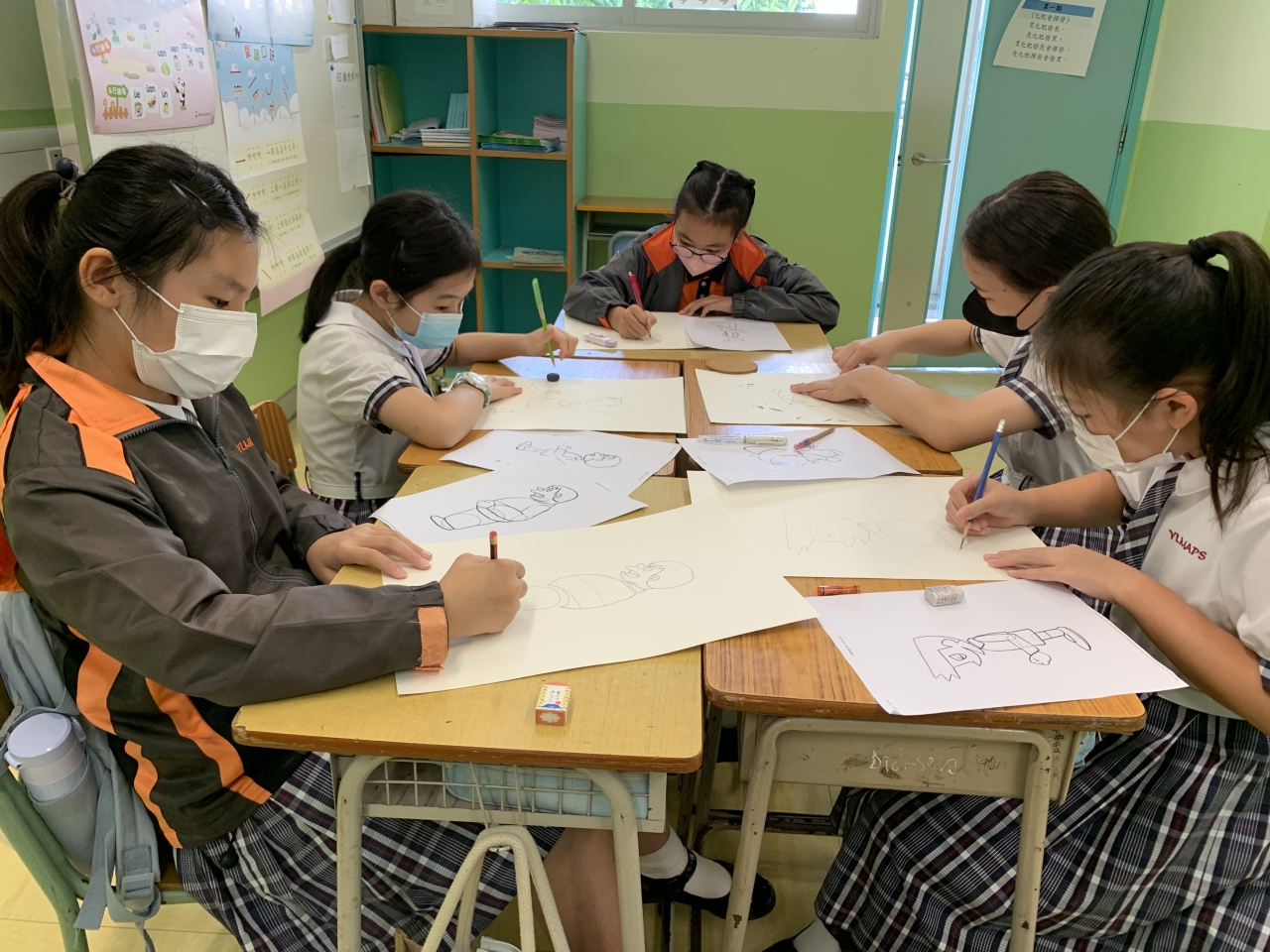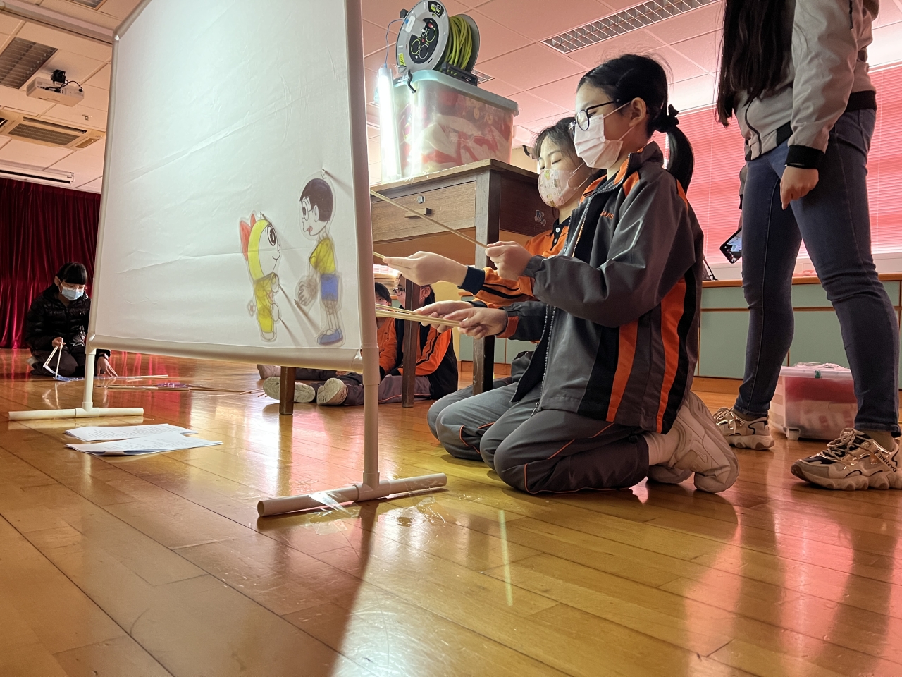 同學們在老師的指導下努力練習皮影戲