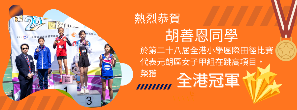 熱烈恭賀胡善恩同學於第28屆全港小學區際田徑比賽女子甲組跳高中榮獲全港冠軍